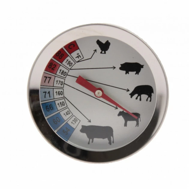 Ce thermomètre à sonde convient notamment pour mesurer la température des viandes pendant les cuissons. Le cadran présente des visuels par viande rattachés à une zone de cuisson marqué en rouge pour une meilleur lisibilité.