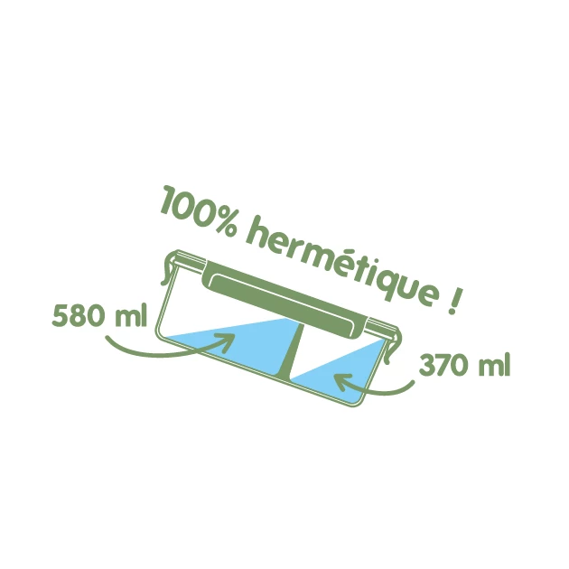 La boîte alimentaire se compose d’un récipient en verre borosilicate sans Bisphénol A, ainsi que d’un couvercle en plastique équipé d’un joint silicone amovible et de 4 clapets pour une étanchéité parfaite. Le gros plus de cette boîte conservation est la présence de 2 compartiments au sein du contenant en verre. Ces 2 parties sont séparées par une paroi hermétique vous offrant la possibilité d’y placer votre entrée et votre plat, ou votre plat et votre dessert sans que cela ne se mélange.