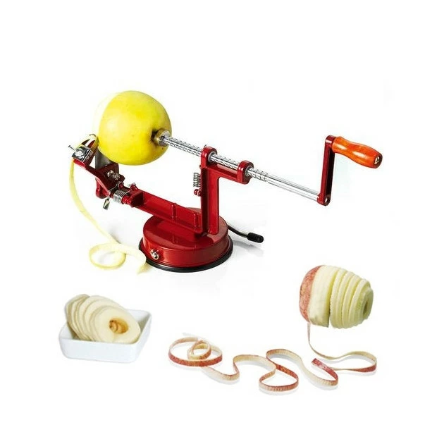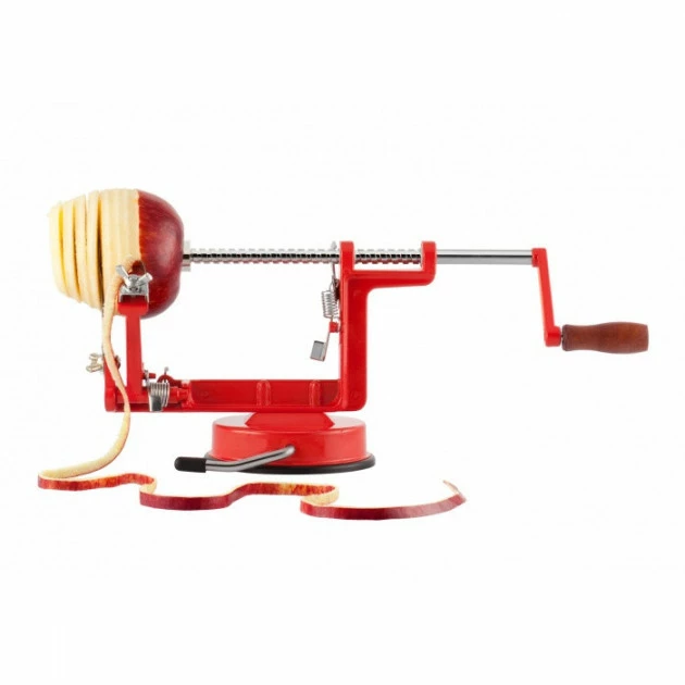Le pèle-pommes rouge pompier présenté par Tellier, vous permet rapidement et en un tour de manivelle de peler, trancher et étrogner votre fruit.