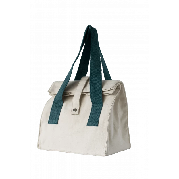D’une dimension de 32 cm par 17 cm de large, le sac repas est doté de solides anses en coton tissé couleur bleu nuit, contrastant parfaitement avec la couleur crème du reste du sac lunch.