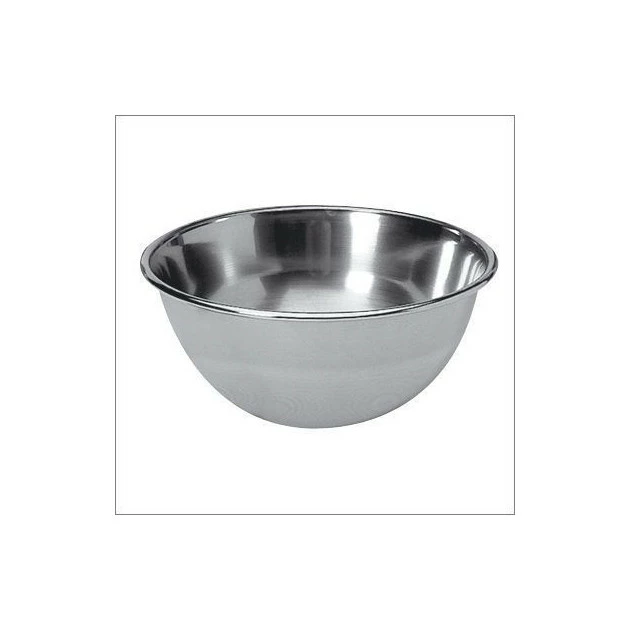 Cul de poule, ou bassine à pâtisserie demi-ronde, en acier inoxydable et fond arrondi avec une petite base plate afin de maintenir le cul de poule à droit sur une surface plane.