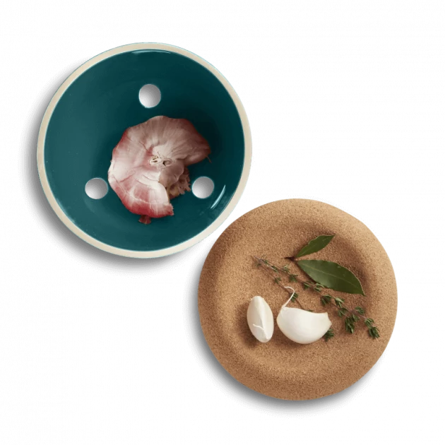 La céramique associée à un couvercle en liège permet de maintenir dans l’obscurité vos condiments, tandis que les trois trous qui y ont été pratiqués régulent le taux d’humidité. Avec ce pot à ail, cette dernière est protégée de la condensation et la germination est retardée.