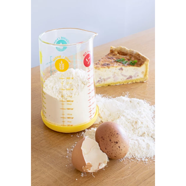 L’ustensile de mesure est en verre borosilicate, équipé d’un bec verseur pour transvaser vos aliments aisément et d’une base en silicone jaune amovible qui apportera couleur, stabilité et protection contre les éventuels chocs. Grâce à la solidité de son matériau, le verre mesureur résiste aux chocs thermiques puisqu’il peut passer du micro-ondes (jusqu’à 300°C) au réfrigérateur, selon vos recettes, pour faire chauffer du lait ou garder au frais une crème avant de la transformer en chantilly !